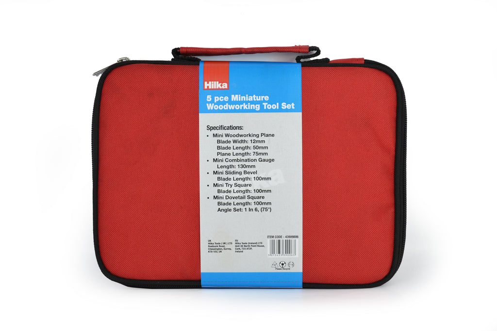 Made to exacting standards this set is ideal for model woodworkers. Precision machined with polished hardwood and solid brass fittings. Packed in a zip-up storage bag for easy safekeeping and storage. Containers: mini woodworking plane, mini combination gauge, mini sliding bevel, mini dovetail square and mini try square with blackened steel blades.